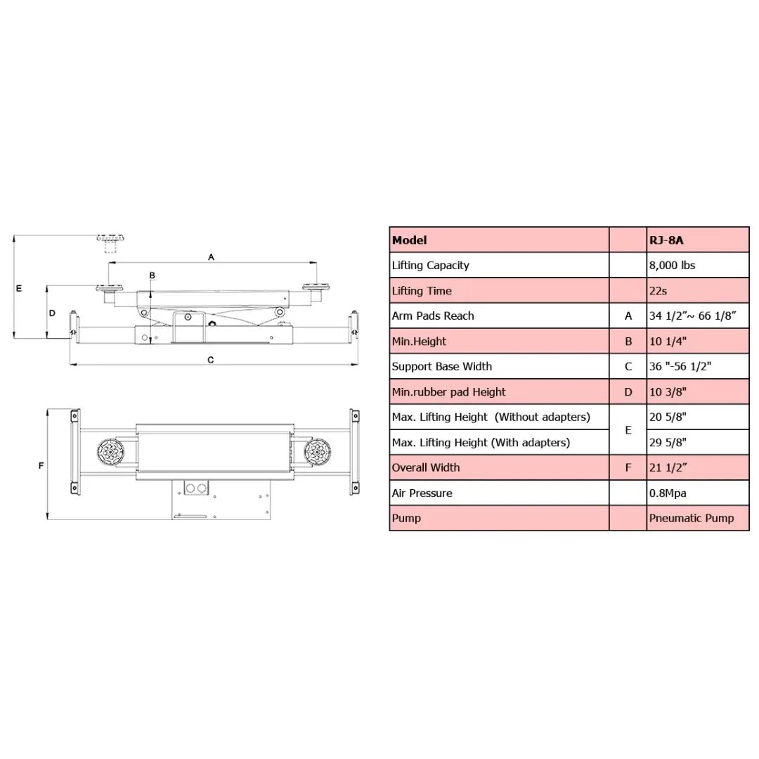 The commercial grade AMGO RJ-8A is built powerful and easy to use. The strengthened structure incorporates AMGO floating rolling technology, can provides a 8000lbs lifting capacity. Its telescoping arms and adjustable lower sliding assembly ensure the versatile application for various vehicles, making it an powerful lifting tool for commercial shops and home garage.
